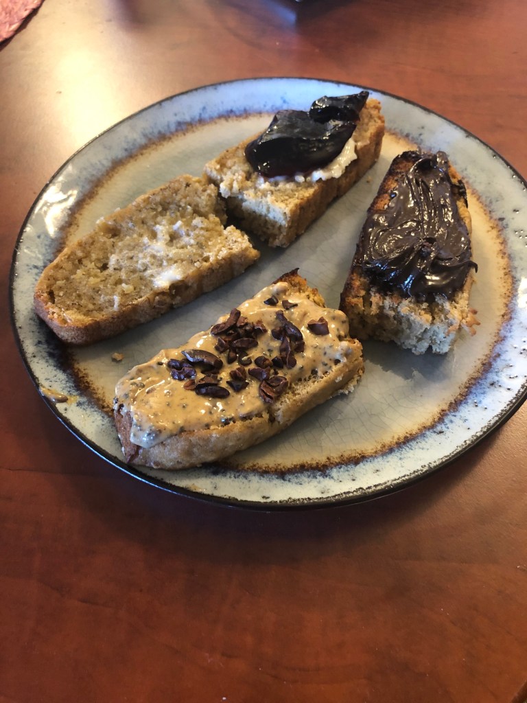 So, I made banana bread. And honestly it is now one of my favorite snacks. Sometimes even a quick grab-and-go breakfast. Grab it in muffin form or slice off a piece from the loaf and toast it. Both ways are good. It is even better when you slather nut butter on top and sprinkle on some cocoa nibs. It tastes extremely decadent, but I know that there is good things in their too, like protein, healthy fats, and antioxidants.